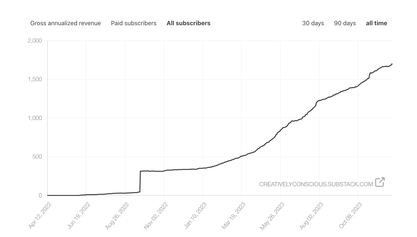 - July - launched a new publication; and a paid members community for folks who wanted to ‘Stay Creative on Substack’ and get Substack education from me. Embedded a podcast as part of the space. Hit 2000 subscribers.