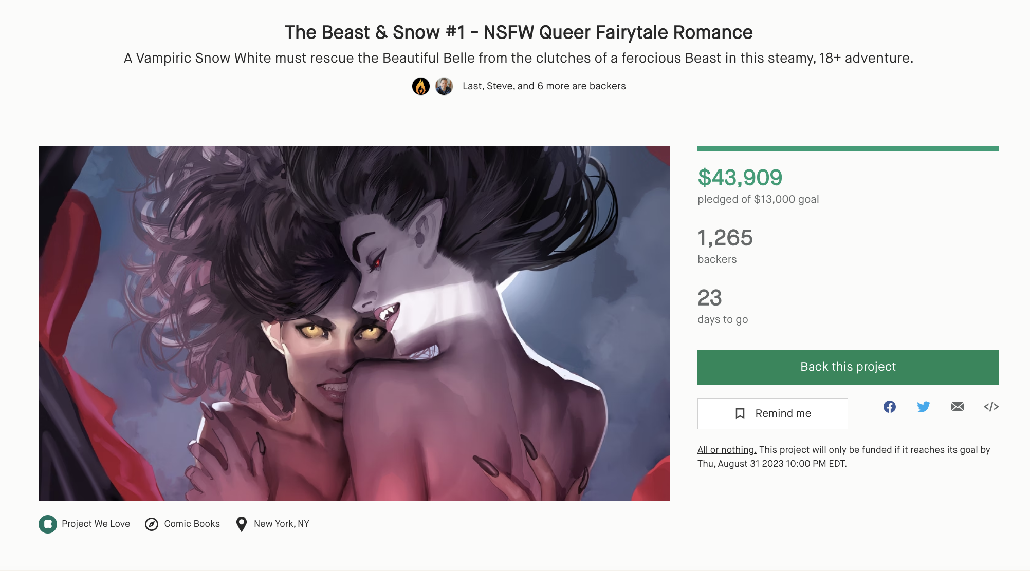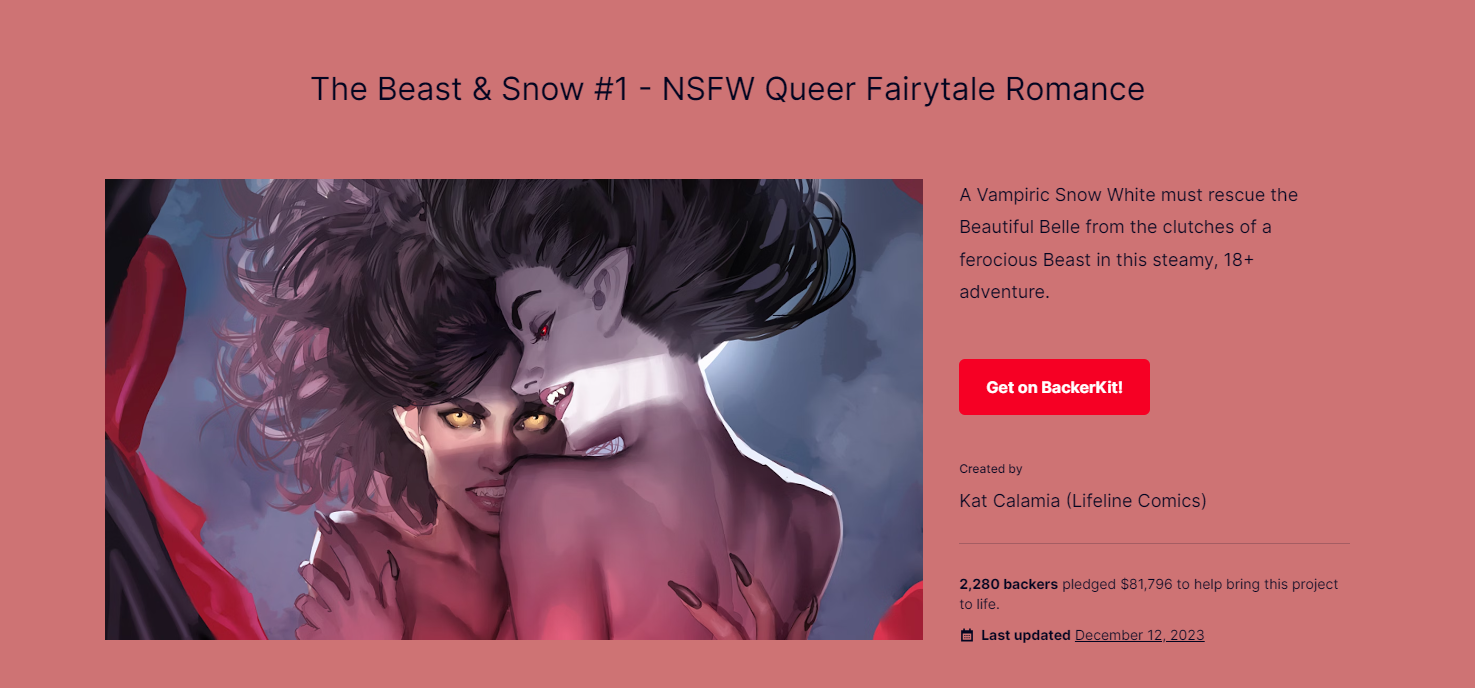 You should always look at the market. Why are the biggest giants in that select market selling? As for Kickstarter, the two most popular types of projects on the platform are campaigns based on something people already know (public domains, collection of previous properties, etc.) and NSFW books. This planted the seed for The Beast & Snow...why couldn't we do both?