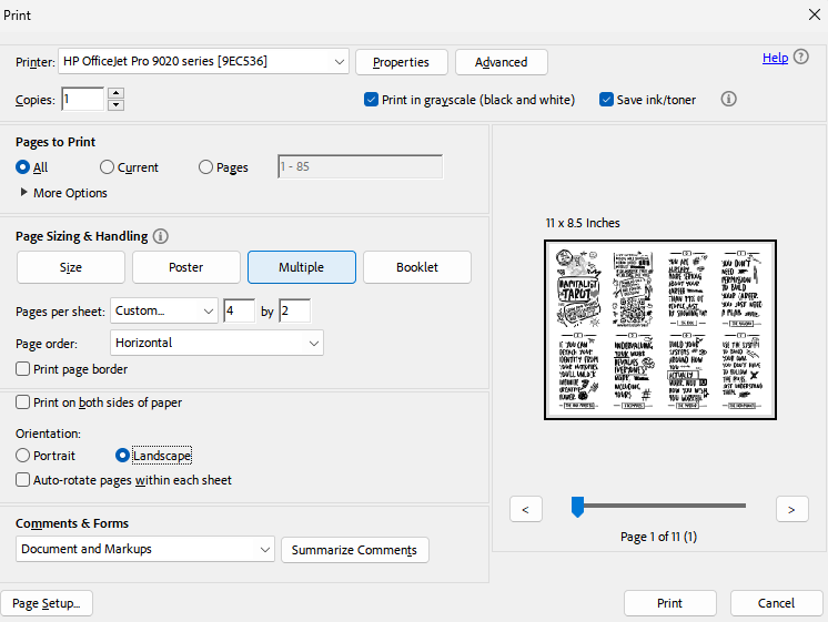 Printing recommendations: We recommend printing these on 8-per page perforated cardstock with the printer printing multiple pages in 4x2 landscape orientation, like this:
