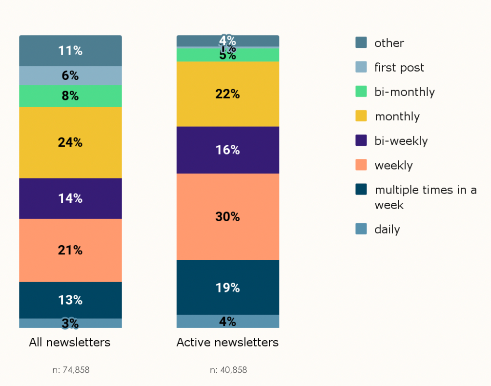 Data for the report is pulled on May 10th. Newsletters that published their latest issue within the past six weeks (between April 1st and May 10th) are classified as “Active.” On the other hand, newsletters that published their latest issue more than six weeks ago (before April 1st) are classified as “ Inactive.”
