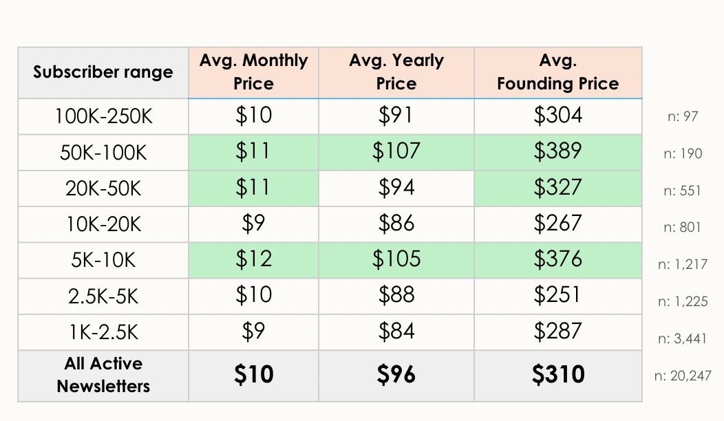 Among the 20k active publications that offer paid subscriptions, the average price was $10/mo and $96/yr. Most newer newsletters prefer to fall way below that, with many wanting to price below the $5/mo that Substack allows as the lowest price. How should we use this report to influence our own paid journey?