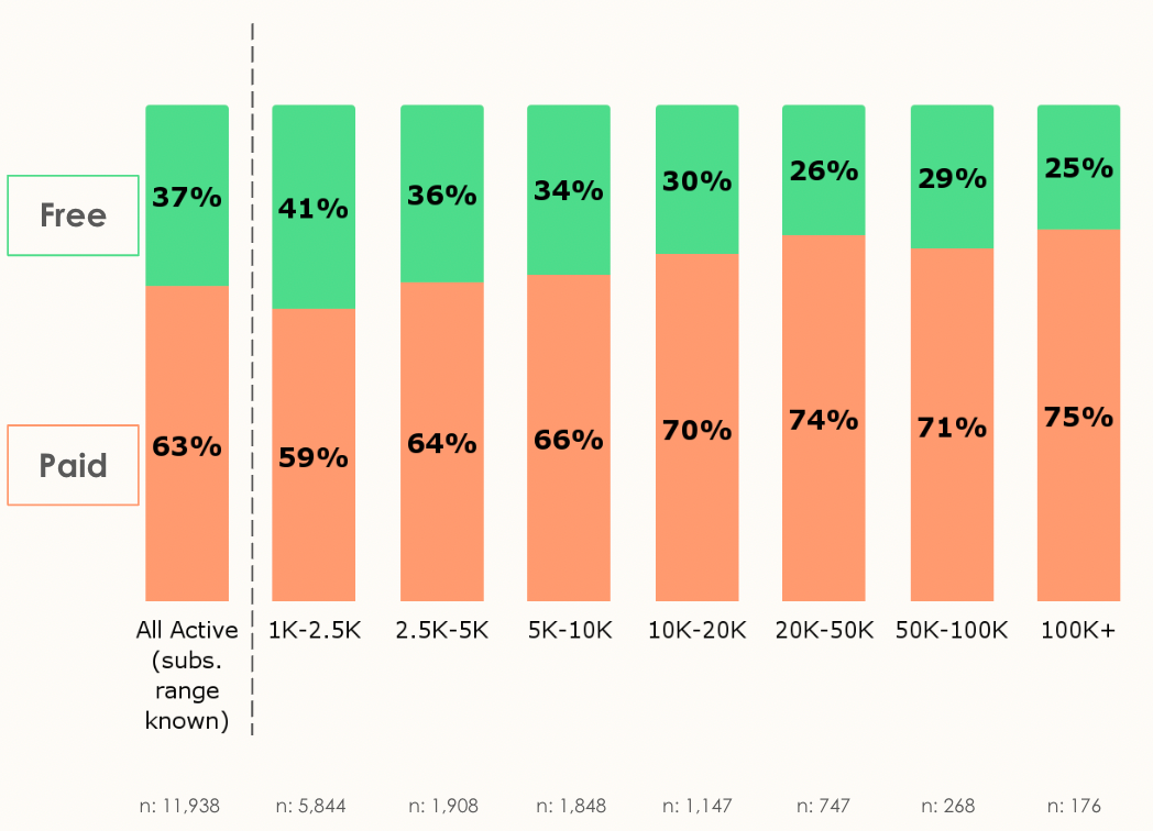 From the data, we see that as the number of subscribers increases, the paid subscription ratio also rises. This suggests that many creators prefer to wait until they’ve reached a certain list size before activating paid subscriptions. They want to ensure that the conversion rate will justify the effort required to produce premium content.